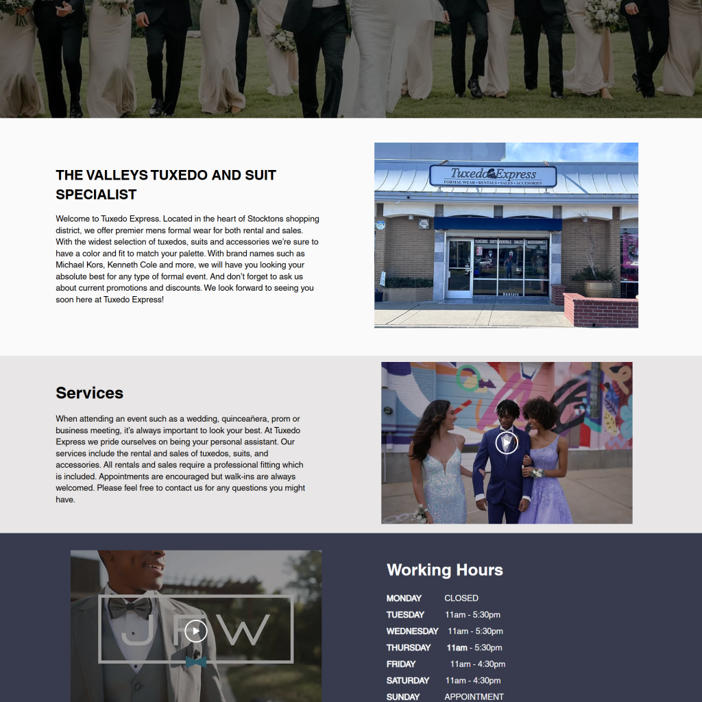 I developed a refined and user-focused website for Tuxedo Express, a premier formalwear retailer based in Stockton’s shopping district. The homepage proudly presents their slogan: “Your look, Your way. The Valleys Tuxedo and Suit Specialist.” With an extensive collection of brand-name tuxedos, suits, and accessories—from Michael Kors to Kenneth Cole—the site offers both rental and purchase options tailored for weddings, proms, quinceañeras, and corporate events.